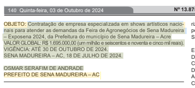 Prefeitura de Sena Madureira paga até 4 vezes mais caro por shows da ExpoSena 2024