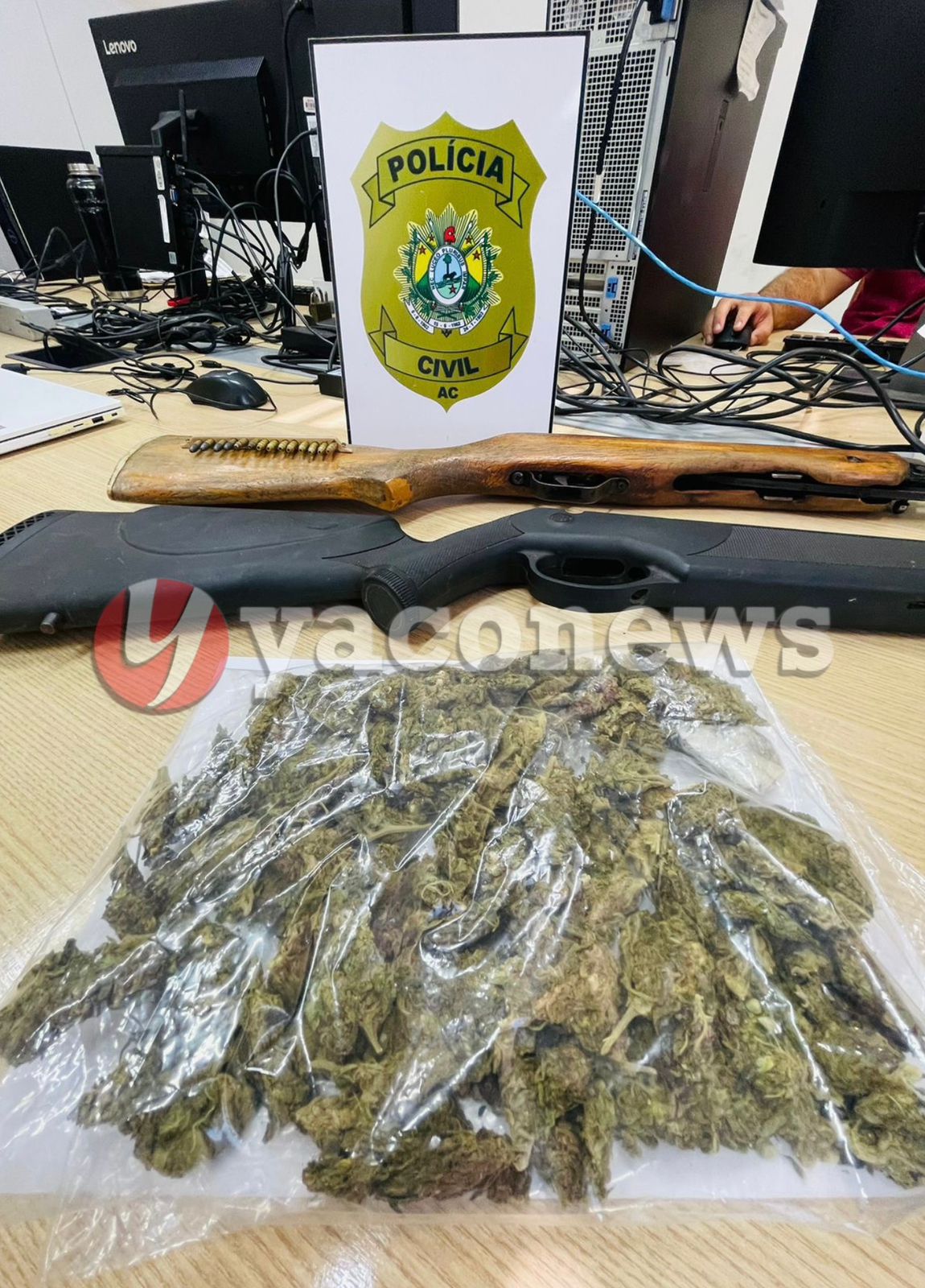 No local, os investigadores encontraram duas armas de fogo adulteradas, tipo espingarda, e uma quantidade significativa de Skank.