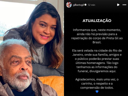 “Informamos que, neste momento, ainda não há previsão para a repatriação do corpo de Preta Gil ao Brasil. Ela será velada na cidade do Rio de Janeiro, onde sua família, amigos e o público poderão prestar suas últimas homenagens”, escreveu Gilberto, pai da cantora.