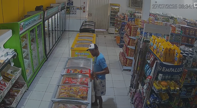 Câmeras de segurança flagraram, no último domingo (27), um furto inusitado no Comercial Frota, localizado no bairro Centro, em Sena Madureira. As imagens mostram o momento em que um homem, ainda não identificado, se dirige ao setor de frios, pega uma bandeja de peito de frango e, discretamente, esconde o item nas partes íntimas antes de deixar o local.