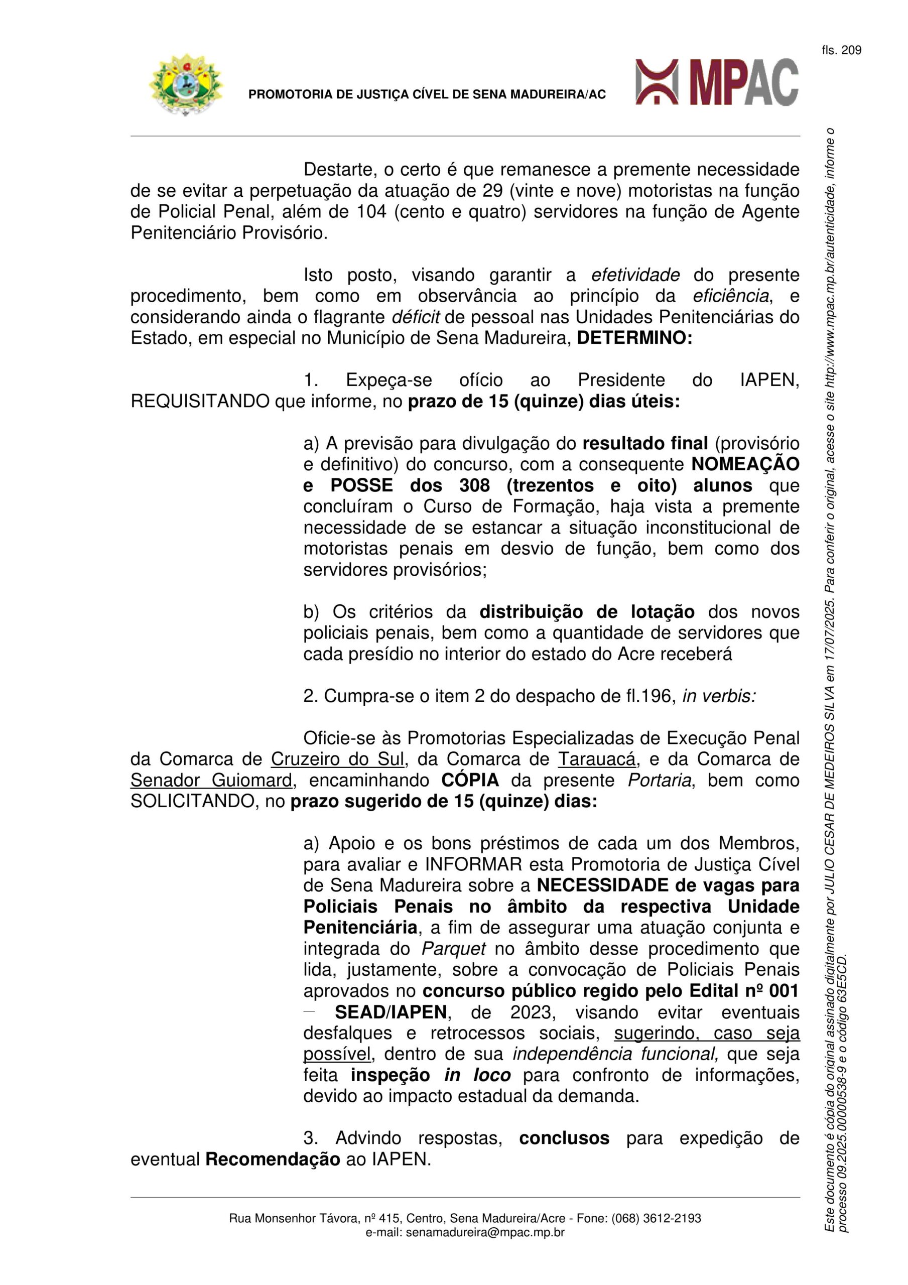 Diante do quadro alarmante, o promotor Júlio César de Medeiros Silva determinou o envio de ofícios ao presidente do IAPEN para que informe a previsão de nomeação dos 308 aprovados e detalhe os critérios de distribuição nas unidades prisionais. Também requisitou apoio das Promotorias de Justiça das comarcas de Cruzeiro do Sul, Tarauacá e Senador Guiomard para que realizem inspeções in loco e relatem a real necessidade de novos policiais penais em suas respectivas jurisdições.
