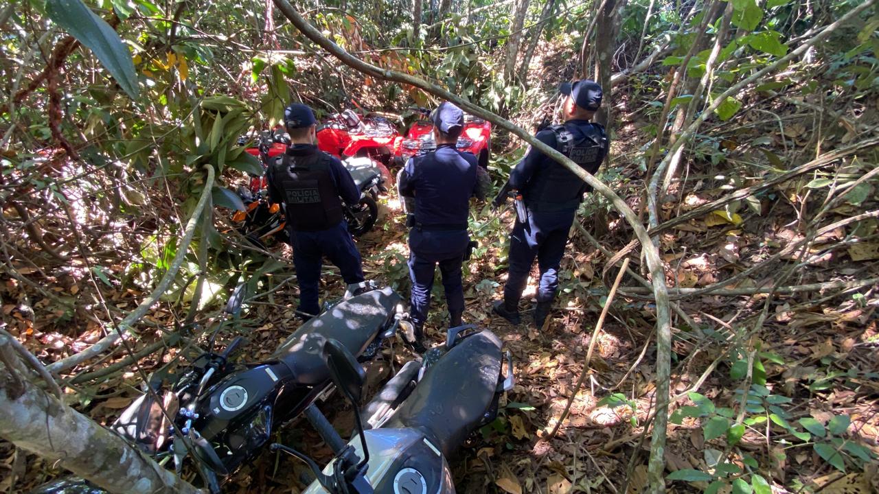 Após buscas pela localidade, 4 motocicletas sendo 3 Titan Fan, uma Pop 100 e dois quadriciclos foram encontrados escondidos em aérea de mata, dentro de uma propriedade rural aparentemente abandonada.
