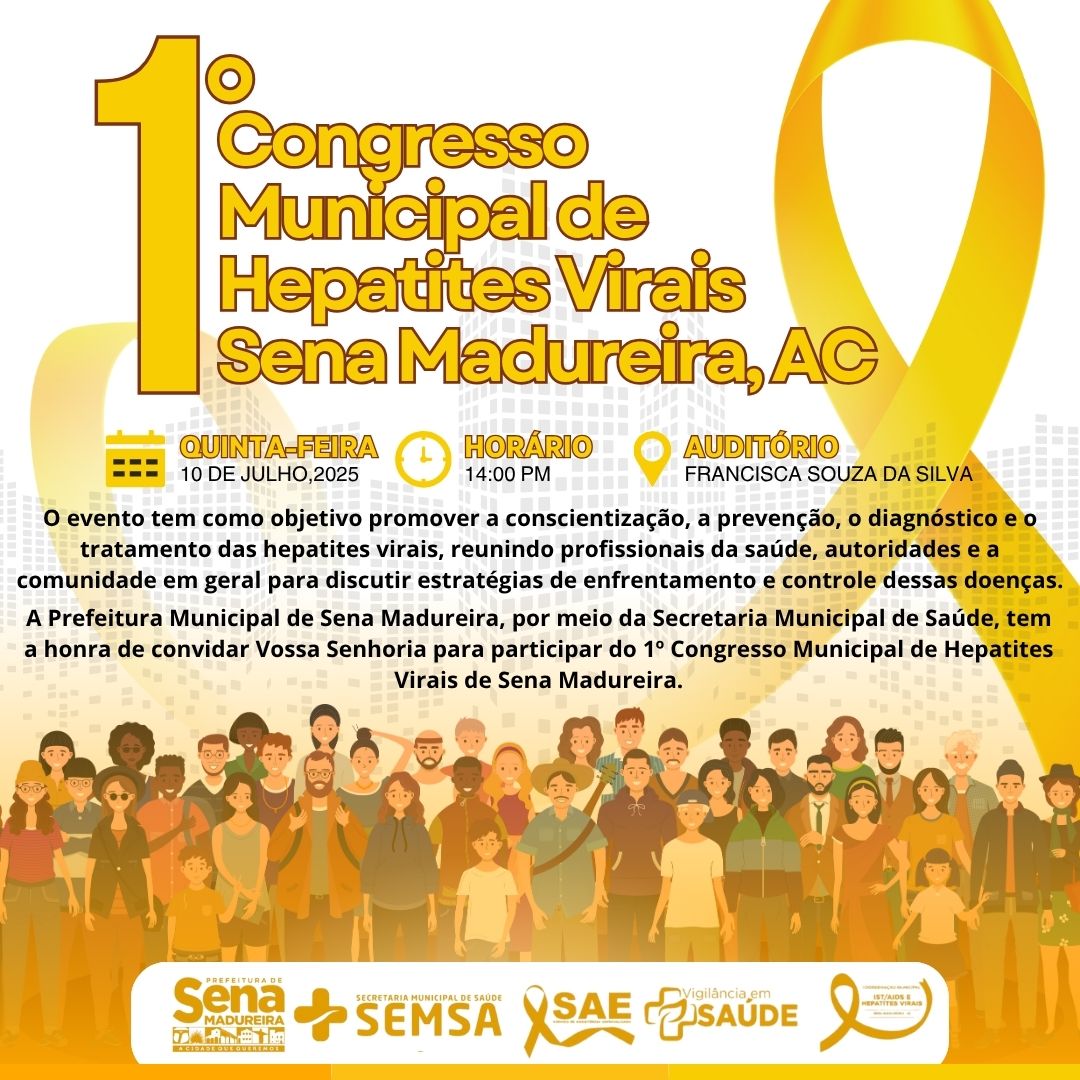 A Prefeitura de Sena Madureira, por meio da Secretaria Municipal de Saúde (SEMSA), promove nesta quinta-feira, 10 de julho de 2025, o 1º Congresso Municipal de Hepatites Virais, com início às 14h, no auditório Francisca Souza da Silva.