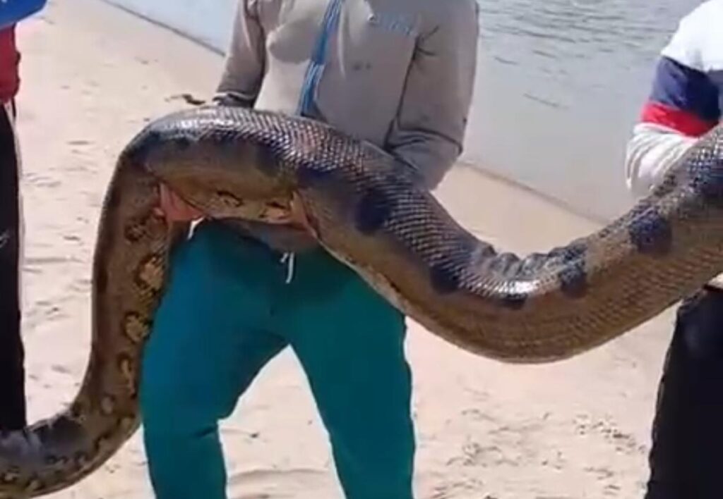 Nas imagens, é possível ver o momento em que a serpente, já sem vida, é retirada da água com o auxílio de uma ricuca, armadilha artesanal comumente utilizada em pescarias na região. Os pescadores demonstram espanto com o tamanho do animal. Um deles, enquanto grava a cena, comenta: “Olha o que deu a nossa pescaria”.