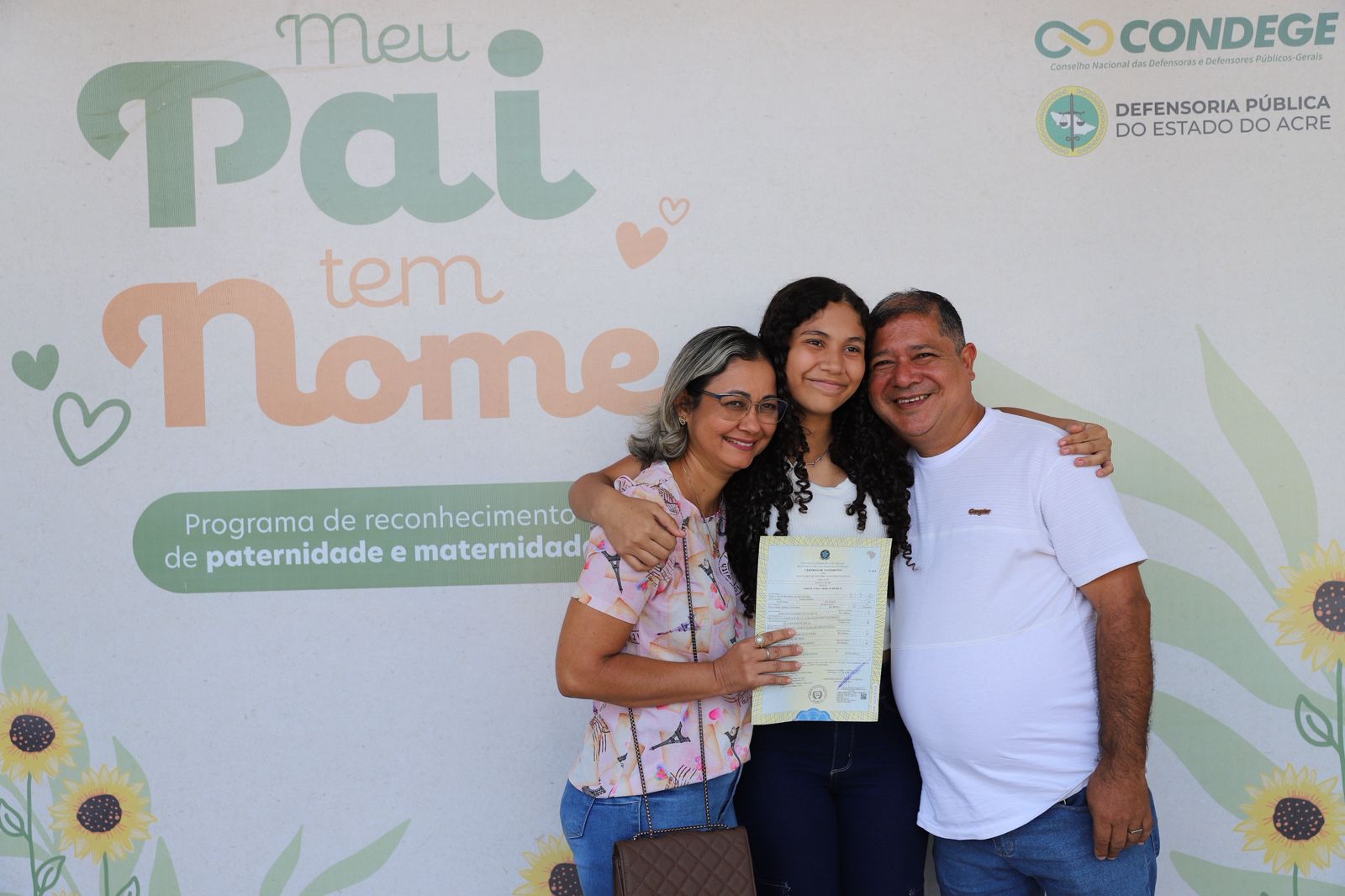 Em um ato de amor e reconhecimento, a adolescente Ana Clara de Oliveira Nascimento, de 13 anos, teve o nome de seus tios, Dejanir José de Souza e Mirian Matias do Nascimento, incluído oficialmente em sua certidão de nascimento. A conquista foi possível durante a ação “Meu Pai Tem Nome”, da Defensoria Pública do Acre.