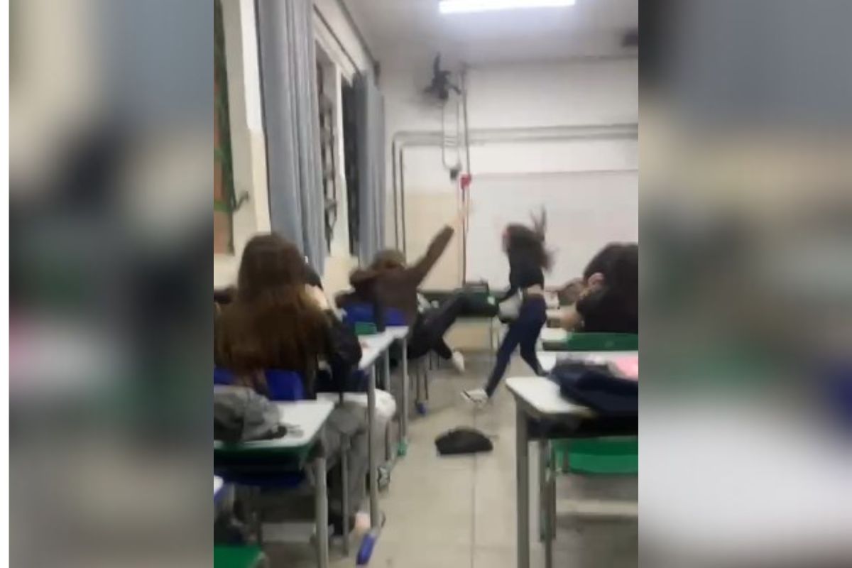 Já nessa quinta-feira, a briga ganhou proporções mais graves. Vídeos gravados e divulgados (veja abaixo) por colegas de classe mostram que uma das jovens, de 17 anos, dá socos no rosto da outra, de 18, que saca uma tesoura da cintura, com a qual golpeia a outra aluna, ferindo-a na região da cabeça (que sangra).