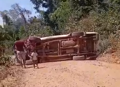 Segundo relatos de moradores locais, o motorista de uma caminhonete perdeu o controle do veículo após colidir com um tronco de árvore, o que fez com que o carro tombasse no meio da estrada .