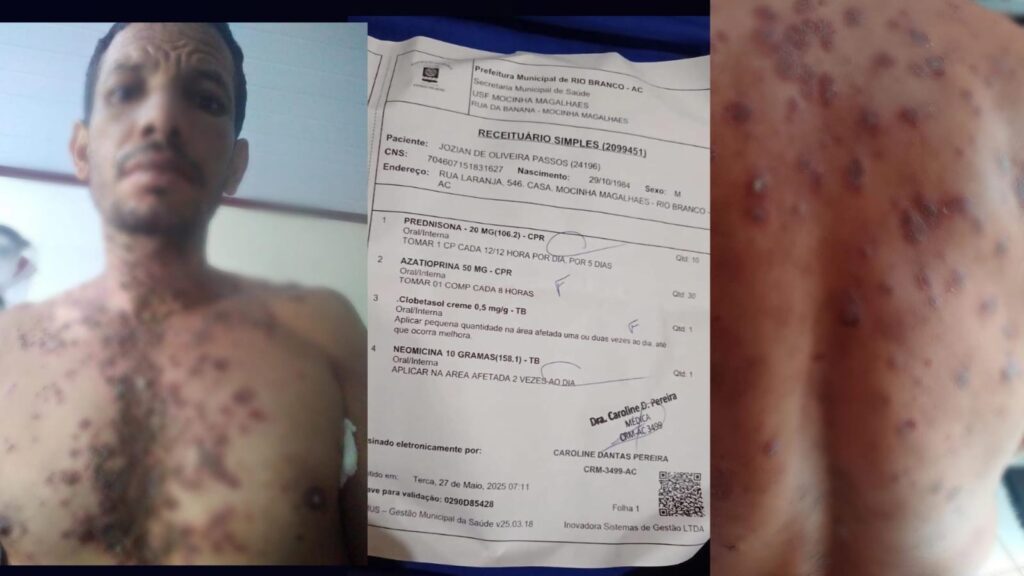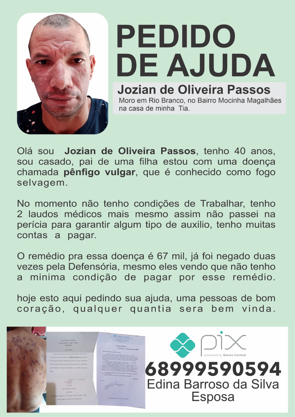 Jozian de Oliveira Passos, de 40 anos, morador do bairro Mocinha Magalhães, em Rio Branco, fez um apelo público por ajuda financeira para custear o tratamento de uma doença rara e grave chamada pênfigo vulgar, também conhecida como “fogo selvagem”.