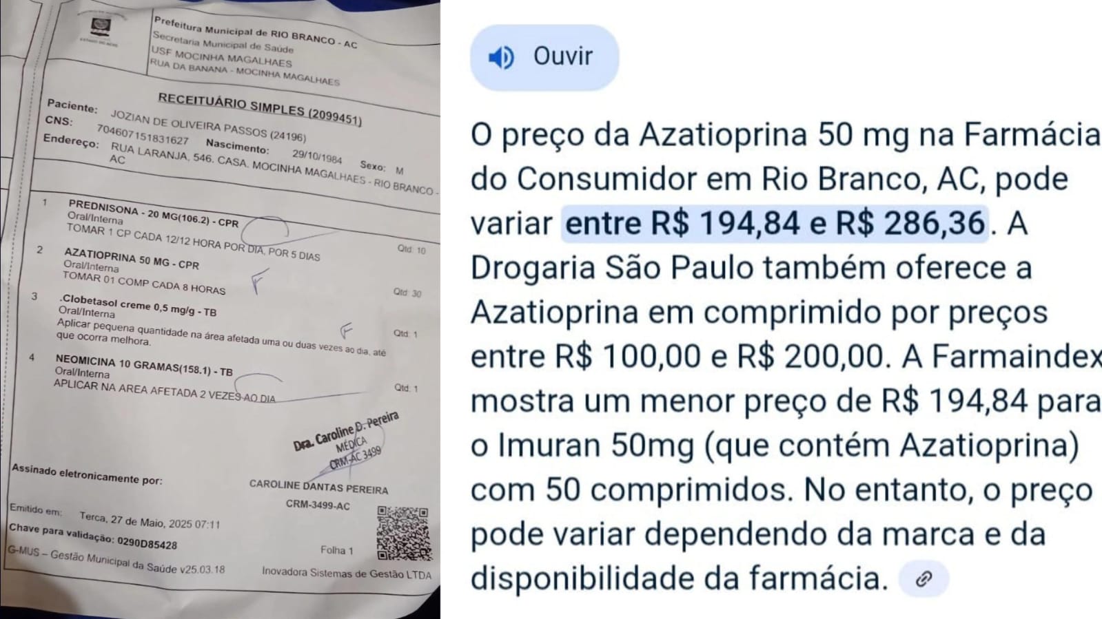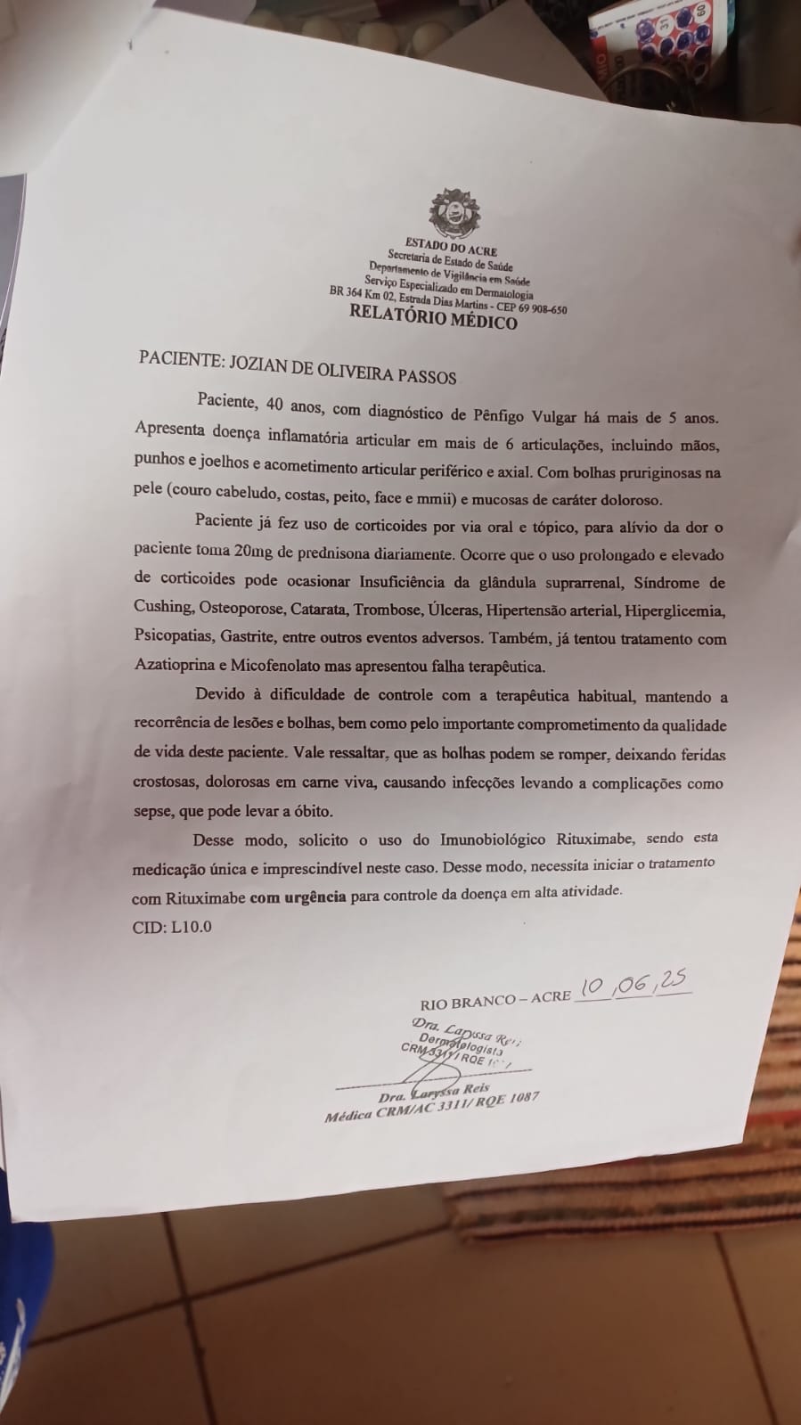 Segundo ele, a doença causa bolhas dolorosas na pele e nas mucosas, além de inflamações nas articulações, afetando gravemente sua qualidade de vida. “No momento não tenho condições de trabalhar e tenho muitas contas a pagar. O remédio que preciso custa R$ 67 mil e já foi negado duas vezes pela Defensoria, mesmo com meus laudos médicos comprovando minha condição”, relata Jozian.
