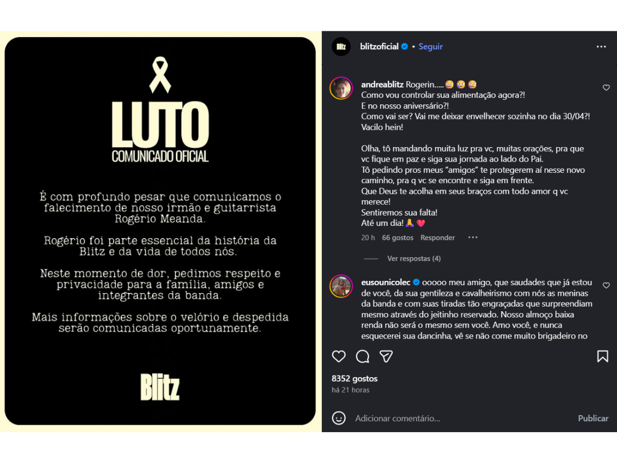 “É com profundo pesar que comunicamos o falecimento de nosso irmão e guitarrista Rogério Meanda. Rogério foi parte essencial da história da Blitz e da vida de todos nós. Neste momento de dor, pedimos respeito e privacidade para a família, amigos e integrantes da banda. Mais informações sobre o velório e despedida serão comunicadas oportunamente. Blitz”, escreveram.