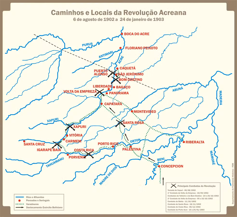 Em 6 de agosto de 1902, teve início a fase mais intensa da Revolução Acreana. Os conflitos vinham se arrastando desde o fim do século XIX, motivados principalmente pela disputa pelo látex, matéria-prima da borracha. Brasileiros — muitos deles nordestinos — que ocupavam a região desde a década de 1870 enfrentavam o governo boliviano, que detinha o controle legal sobre o território. A luta só terminou em 1903, com a incorporação definitiva do Acre ao Brasil.