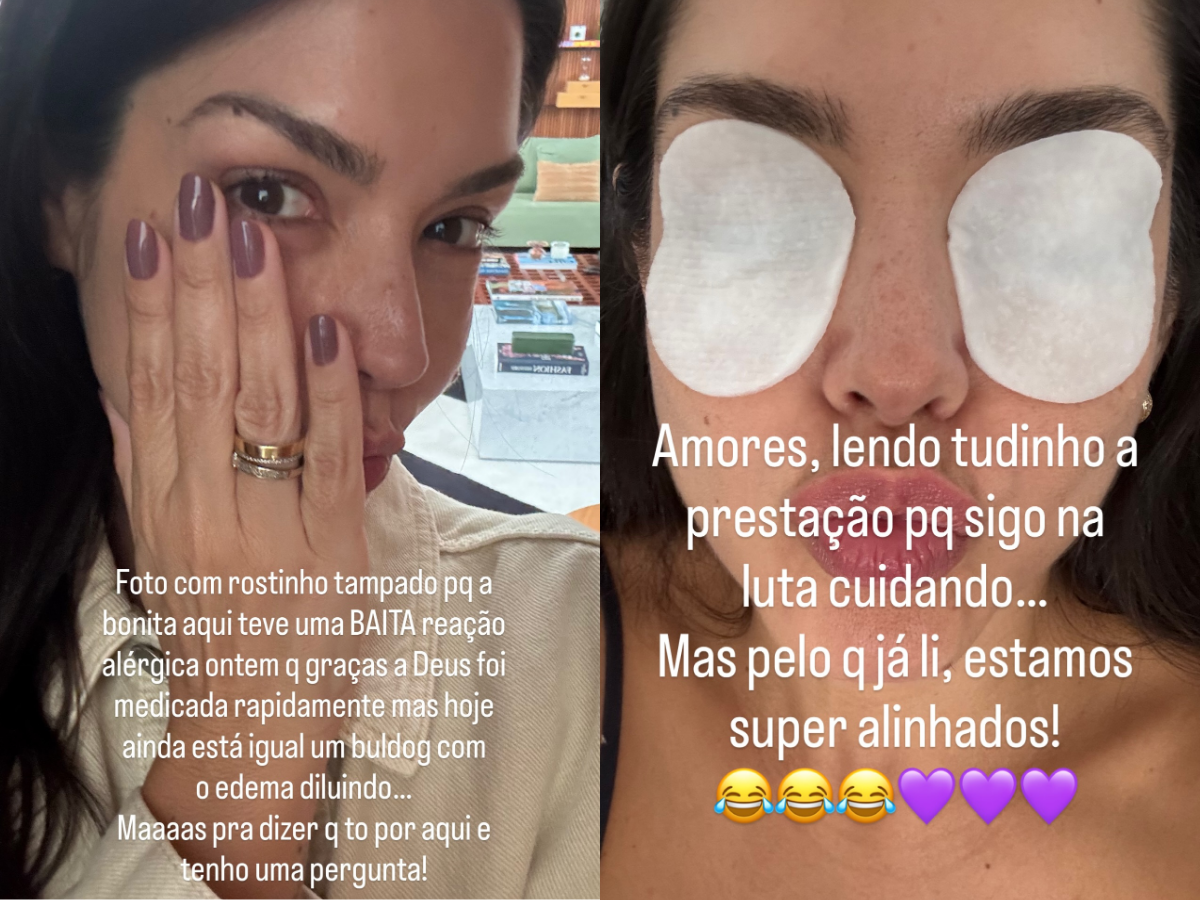 Thais Fersoza mostrou, nesta segunda-feira (25/8), o estado do próprio rosto após enfrentar uma reação alérgica. A apresentadora, de 41 anos, não detalhou a causa do problema, mas contou que precisou ser medicada.