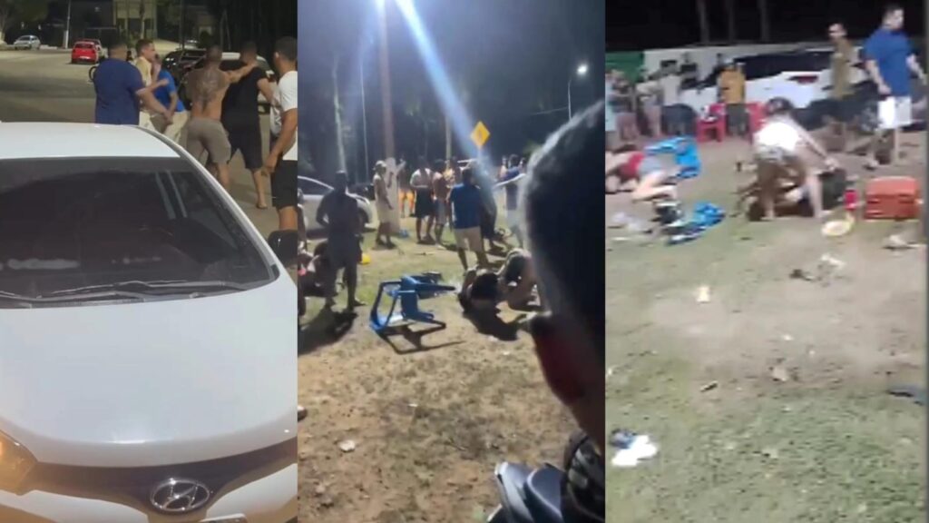 Vídeos que circulam nas redes sociais mostram cenas de violência, com homens trocando socos e mulheres brigando no chão, em duplas, enquanto outras pessoas tentavam separar os envolvidos.