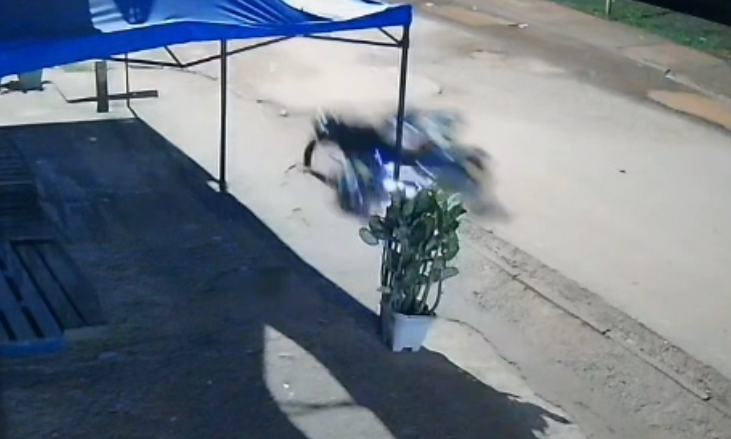 Na madrugada deste domingo (14), um acidente de moto foi registrado na rua Mendes Araújo, em Manoel Urbano. Câmeras de segurança flagraram o momento em que um jovem perde o controle do veículo e se choca contra um jarro de plantas.