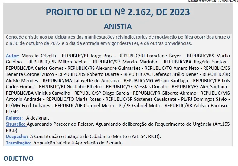 O PL é de autoria coletiva de parlamentares das siglas Republicanos, PL e outras, incluindo Marcelo Crivella (Republicanos-RJ), Tenente Coronel Zucco (Republicanos-RS) e Sóstenes Cavalcante (PL-RJ).