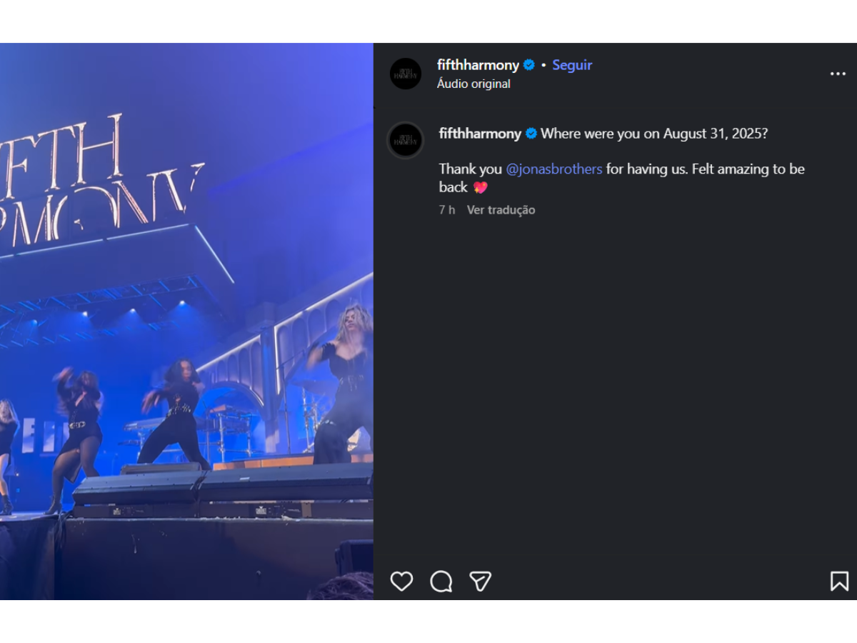 “Onde você estava em 31 de agosto de 2025? Obrigado, Jonas Brothers, por nos receber. Foi incrível estar de volta”, publicaram no Instagram. Nada era postado na rede social desde maio de 2018, quando cada uma seguiu sua carreira solo. Camila Cabello, 28, Lauren Jauregui, 29, Dinah Jane, 28, Normani, 29 e Ally Brooke, 32, anunciaram a pausa em 2018, um ano depois da saída de Camilla.