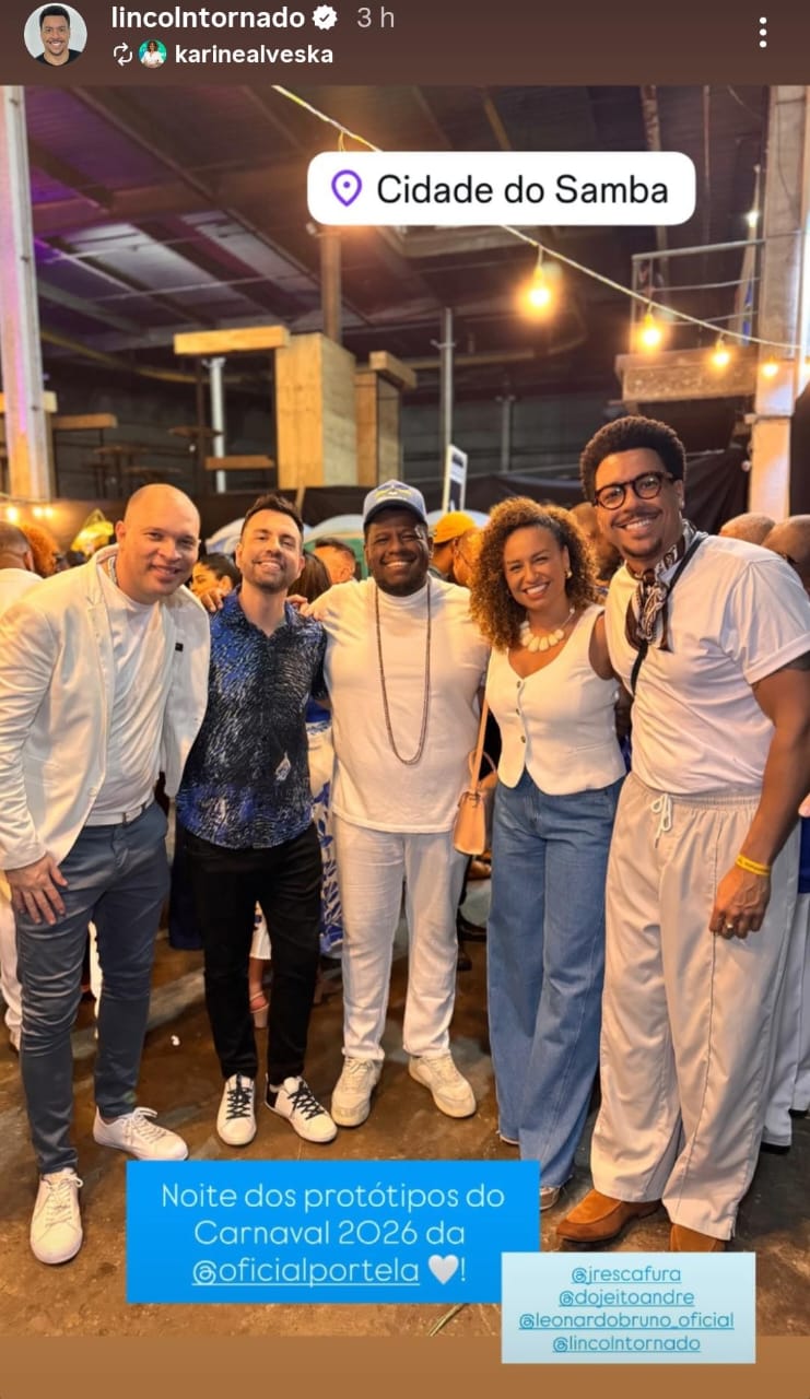 Lincoln Tornado, filho do ator e cantor Tony Tornado, e a apresentadora do “Esporte Espetacular” Karine Alves fizeram sua primeira aparição pública como casal. O encontro ocorreu na última segunda-feira (15/9) durante um evento preparatório para o Carnaval 2026 na quadra da escola de samba Portela, no Rio de Janeiro.