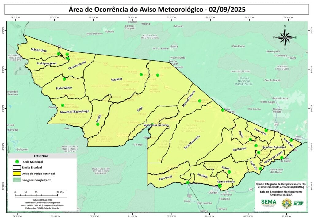 O Acre deve registrar mudanças no clima a partir desta sexta-feira, 5, com a chegada de uma frente fria que avança pelo sul da Amazônia. O alerta foi divulgado nesta terça-feira, 2, pelo Centro Integrado de Geoprocessamento e Monitoramento Ambiental (Cigma), da Secretaria de Estado do Meio Ambiente (Sema), em parceria com o Centro de Previsão de Tempo e Estudos Climáticos (CPTEC), do Ministério da Ciência, Tecnologia e Inovação.