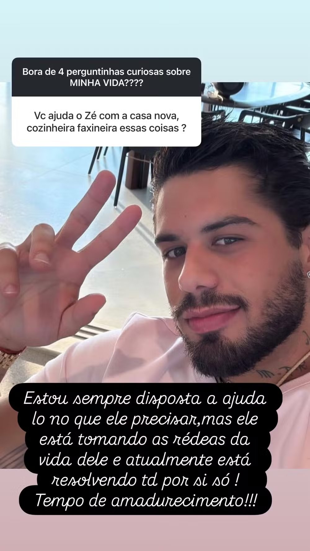 Poliana Rocha, mãe do cantor Zé Felipe, comentou em sua conta do Instagram sobre a fase atual do filho, que vive sozinho em sua nova casa. Questionada por seguidores se ajuda o cantor com tarefas domésticas, Poliana afirmou que está disponível, mas destacou que ele prefere resolver as situações de forma mais independente. “Estou sempre disposta a ajudá-lo no que precisar, mas ele está tomando as rédeas da vida dele e atualmente está resolvendo tudo por si só. Tempo de amadurecimento”, declarou.