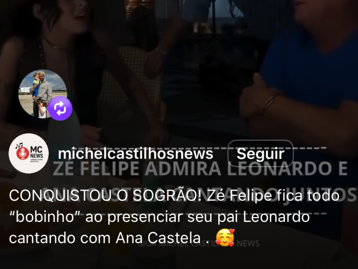 A movimentação de Zé Felipe nas redes sociais acendeu ainda mais as especulações sobre um possível romance com Ana Castela. O cantor repostou um vídeo publicado por um perfil de fãs, onde seu pai, Leonardo, aparece cantando ao lado da boiadeira. A legenda original, “Conquistou o sogrão! Zé Felipe fica todo bobinho ao presenciar seu pai Leonardo cantando com Ana Castela”, acabou sendo vista como mais uma suspeita de que os dois estão vivendo um relacionamento.