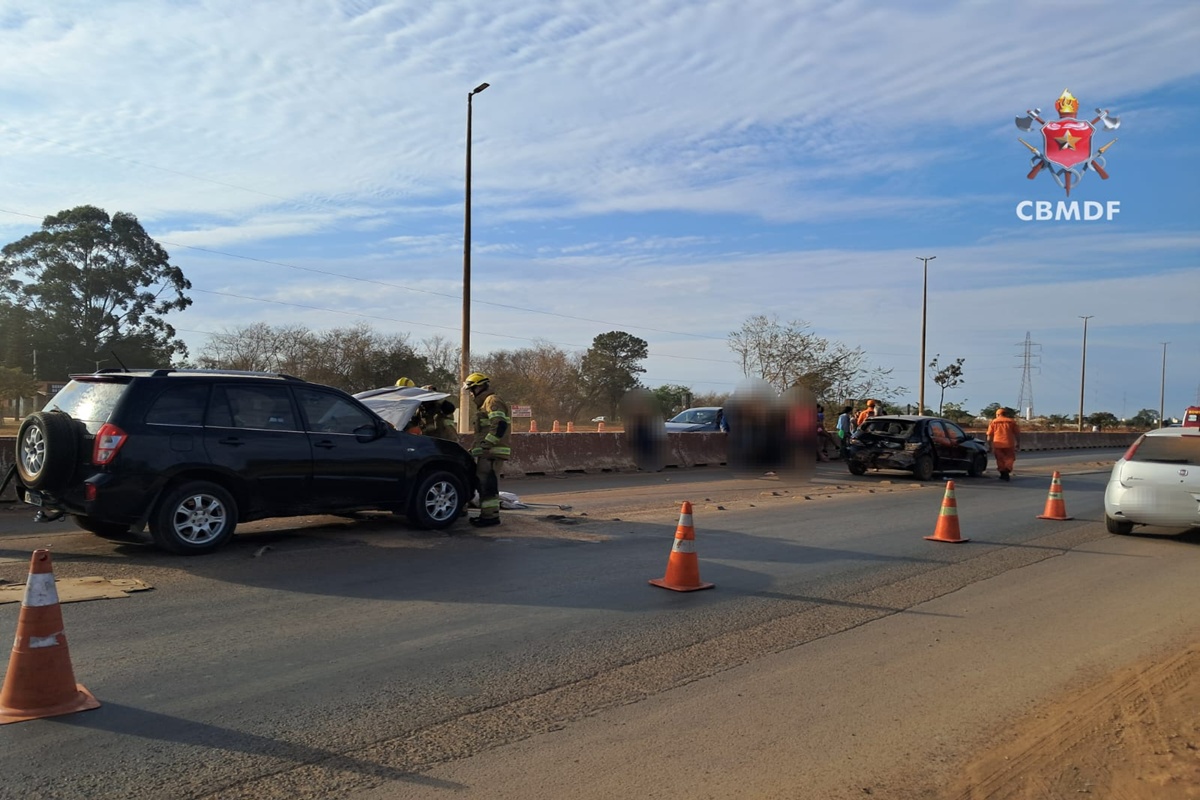 Um engavetamento de veículos deixou três pessoas feridas na DF-001.