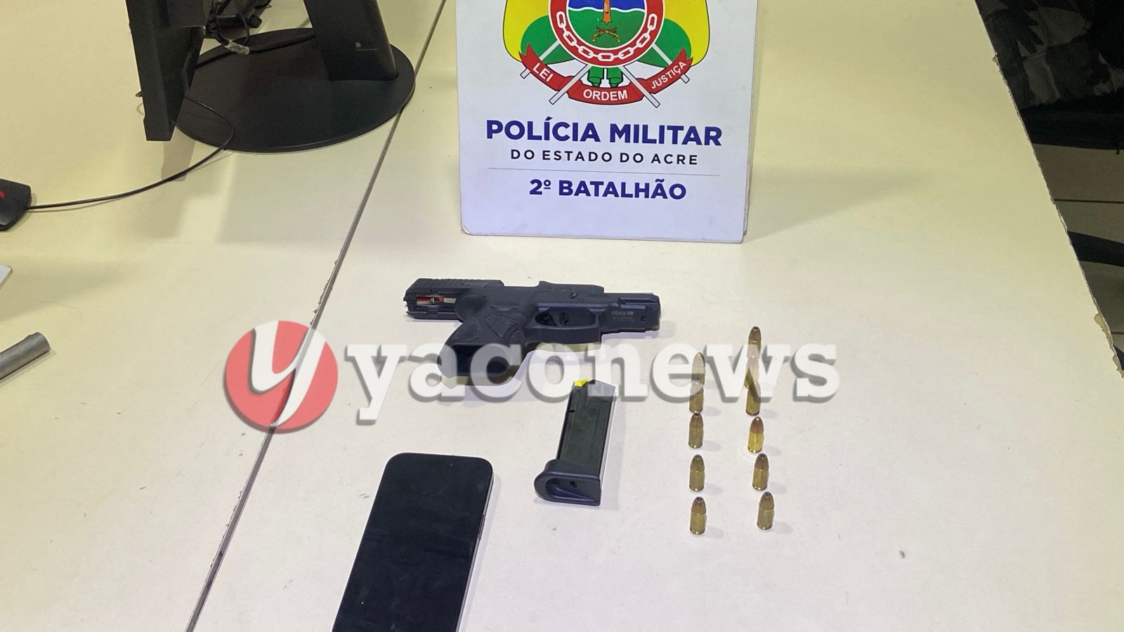 Na revista veicular, os militares localizaram uma pistola Taurus G2C calibre 9mm escondida na porta de trás do veículo, sem carregador. No bagageiro, foi encontrado o carregador com 11 munições intactas. Segundo a polícia, os detidos têm envolvimento com organização criminosa e possivelmente planejavam novos ataques em Rio Branco.