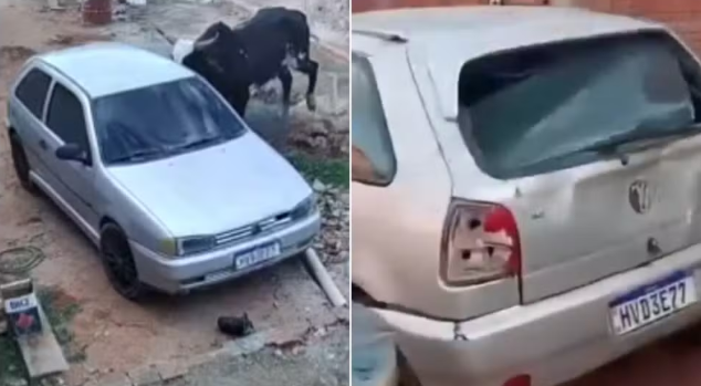 O animal, em alta velocidade, empurrou um carro com os chifres e deslocou um carretel de madeira que estava encostado na parede. O veículo ficou completamente destruído, com janelas quebradas e retrovisor arrancado. Além disso, a porta de vidro da entrada da casa também foi quebrada durante o incidente.