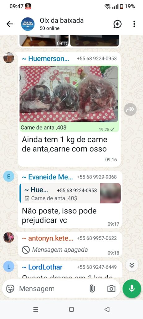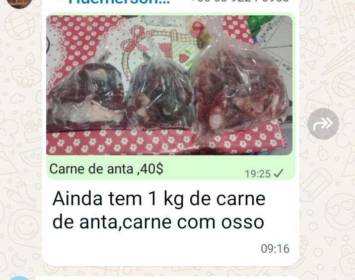 Uma denúncia enviada à reportagem revela que um grupo de WhatsApp estaria comercializando carne de anta um animal silvestre protegido por lei. Segundo as informações, o quilo da carne estaria sendo oferecido por R$ 40,00.