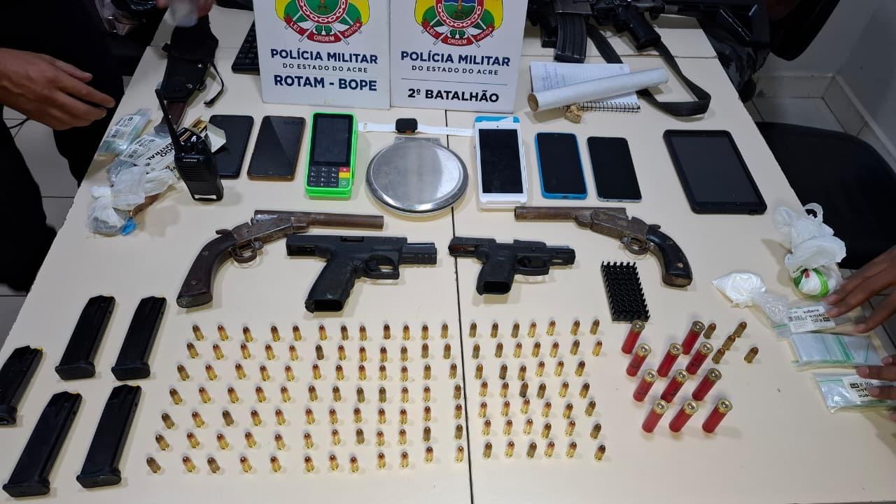 No interior da casa, os suspeitos se renderam e informaram o local onde escondiam as armas e as Drogas. Durante as buscas, os policiais apreenderam: