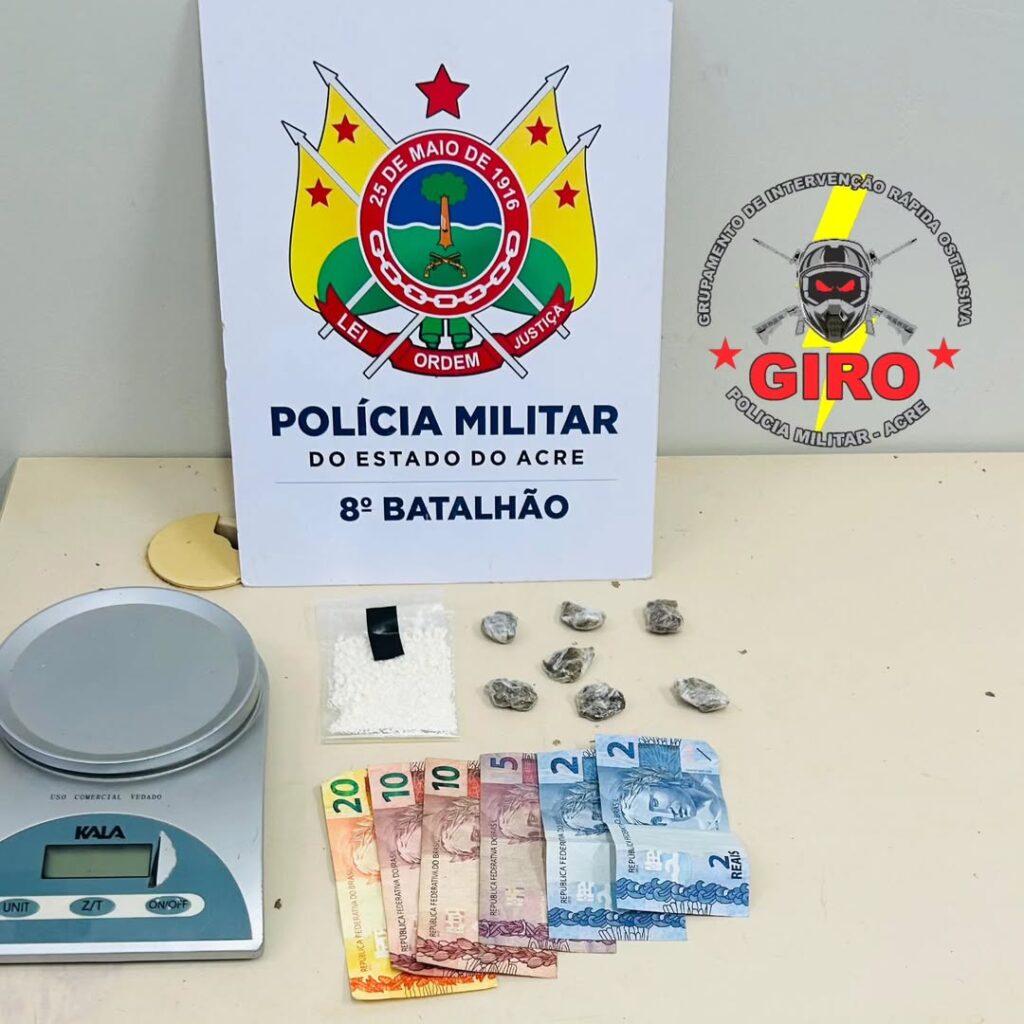 Segundo a PM, o suspeito demonstrou nervosismo ao perceber a aproximação da equipe e tentou se desfazer de um pacote, o que chamou a atenção dos militares. Durante a abordagem, os policiais encontraram substâncias semelhantes à pasta base de cocaína e maconha, além de uma quantia em dinheiro.