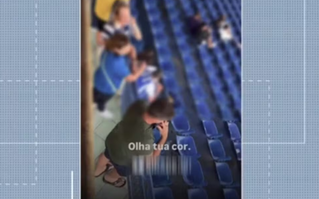 Um homem que a acompanhava também é ouvido proferindo ofensas xenofóbicas, enquanto outro torcedor parece alertá-la sobre o teor agressivo das falas.