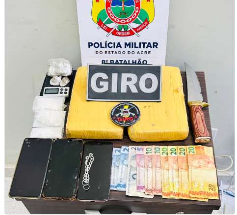 Na ação, os policiais apreenderam aproximadamente 2,1 quilos de maconha, cerca de 40 gramas de substância análoga à pasta base de cocaína, além de uma balança de precisão, uma faca, dinheiro em espécie e aparelhos celulares.