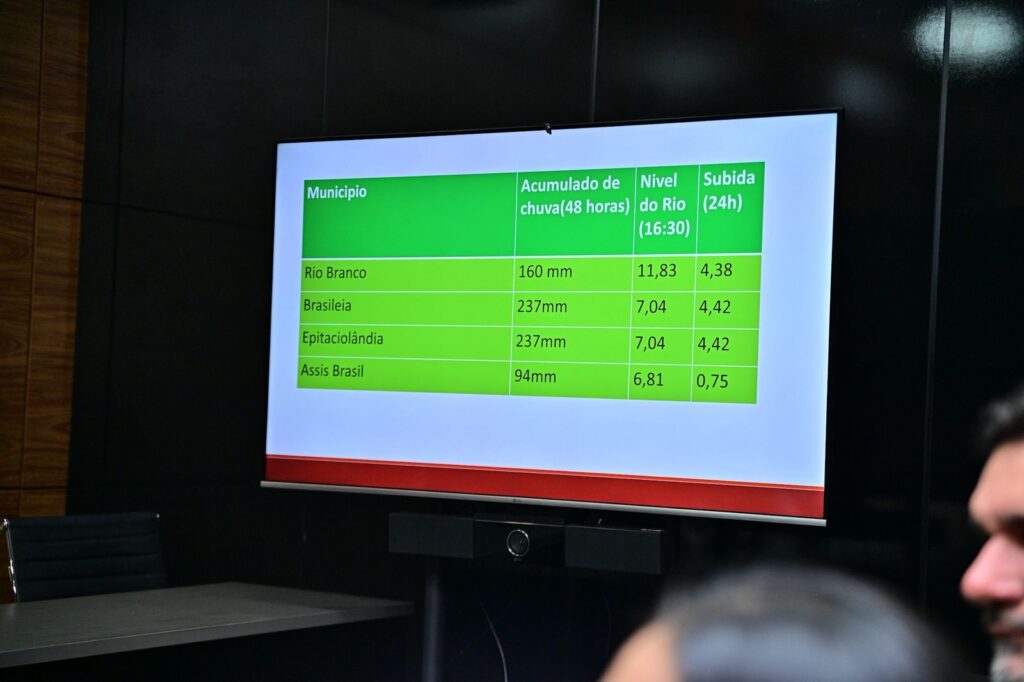 Dados apresentados durante a reunião apontam que, nas últimas 24 horas, o volume de chuvas provocou uma elevação rápida no nível do Rio Acre, que chegou a 11,49 metros na tarde desta sexta-feira, segundo a última leitura da Defesa Civil Estadual.
