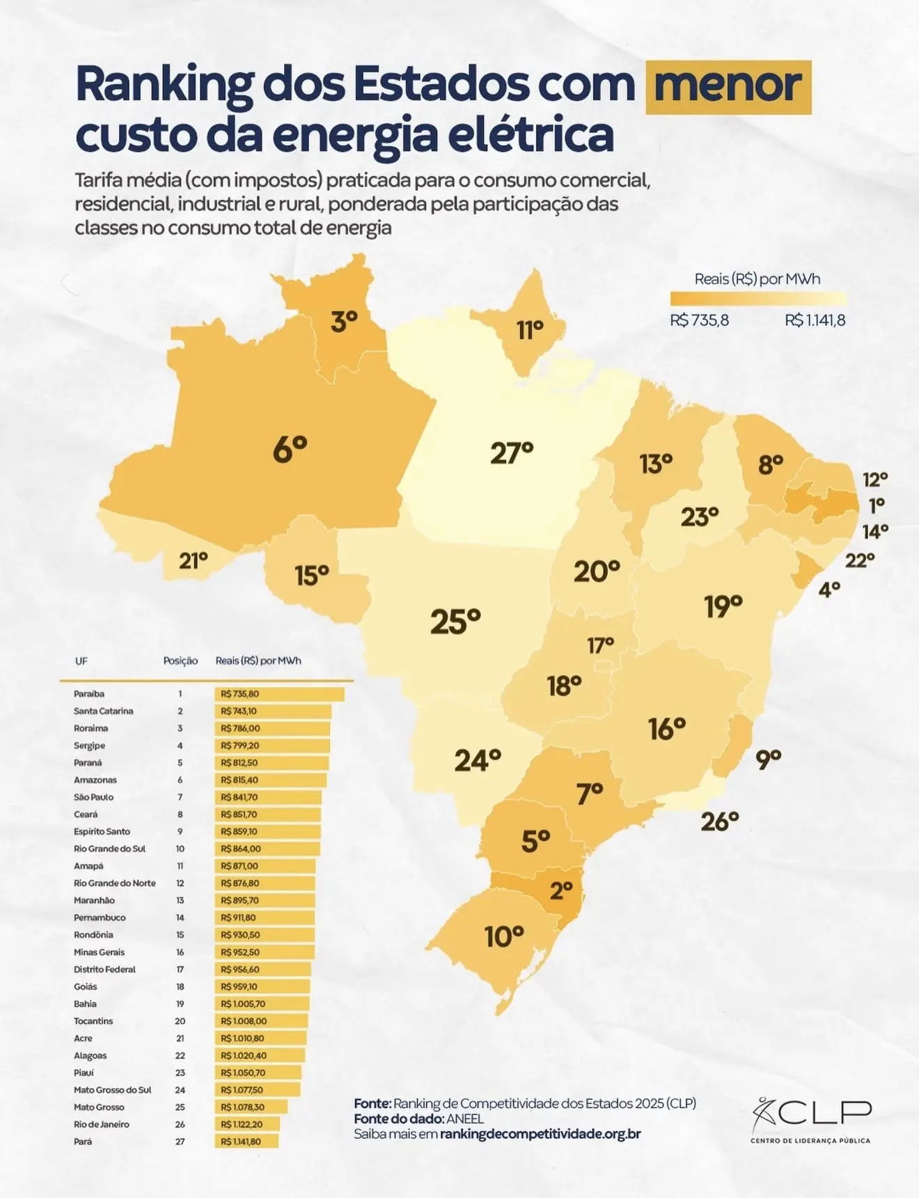 No comparativo nacional, a Paraíba ocupa a primeira posição, com a energia mais barata do país, registrando tarifa média de R$ 735,00 por MWh. Na outra ponta do ranking está o Pará, que apresenta o maior custo médio de energia elétrica entre os estados, com R$ 1.180,00 por MWh.