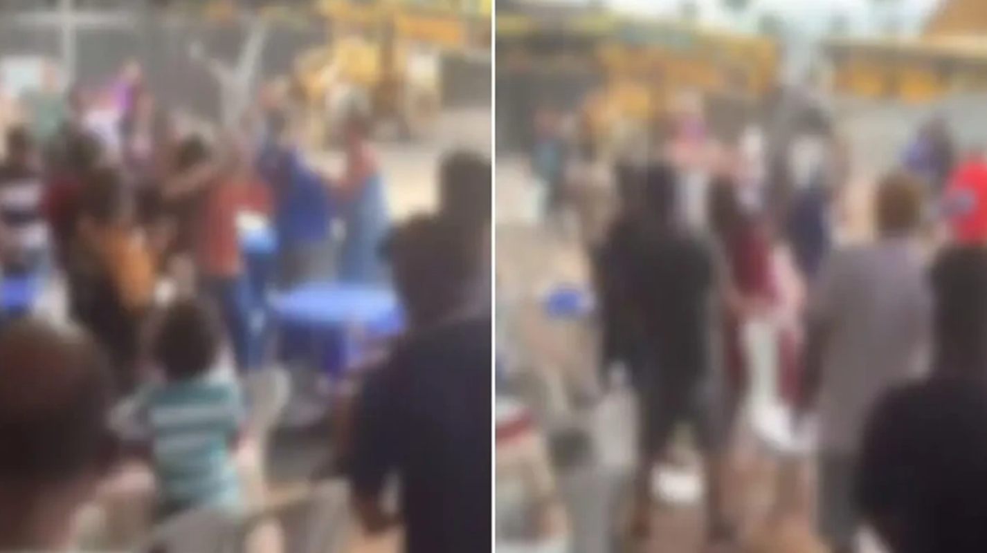 Em um dos registros feito com um celular, uma das envolvidas aparece levantando uma cadeira de plástico na tentativa de atingir a outra