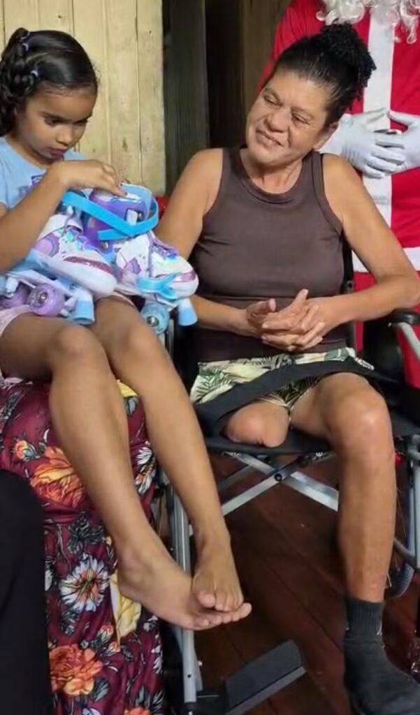 A entrega dos presentes aconteceu na última quarta-feira (12), no bairro Cidade Nova, no Segundo Distrito de Rio Branco. Diana recebeu os tão sonhados patins, enquanto a avó, Carmosa Fernandes de Oliveira, de 52 anos, foi surpreendida com a nova cadeira de rodas.