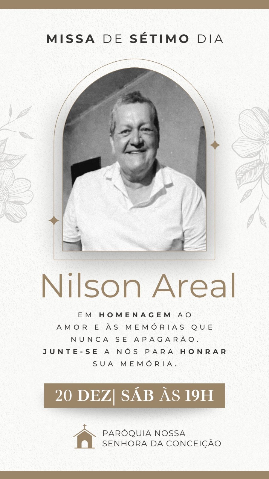 Será realizada neste sábado, 20 de dezembro, a missa de sétimo dia em homenagem ao ex-prefeito de Sena Madureira, Nilson Roberto Areal de Almeida, conhecido como Nilson Areal. A celebração acontece às 19h, na Paróquia Nossa Senhora da Conceição, em Sena Madureira.
