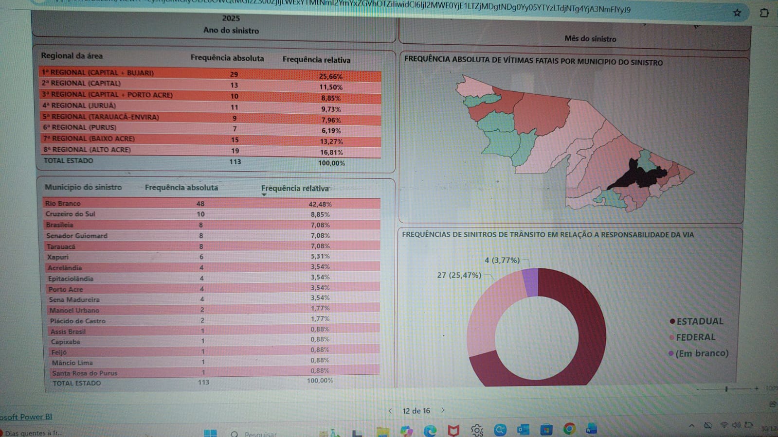Já em 2025, a mesma 1ª Regional (Capital e Bujari) continuou concentrando o maior número de ocorrências, porém com 29 vítimas, reduzindo sua participação para 25,66%. A 8ª Regional (Alto Acre) passou a ocupar posição de destaque, com 19 registros (16,81%), enquanto a 7ª Regional (Baixo Acre) apresentou 15 casos (13,27%).