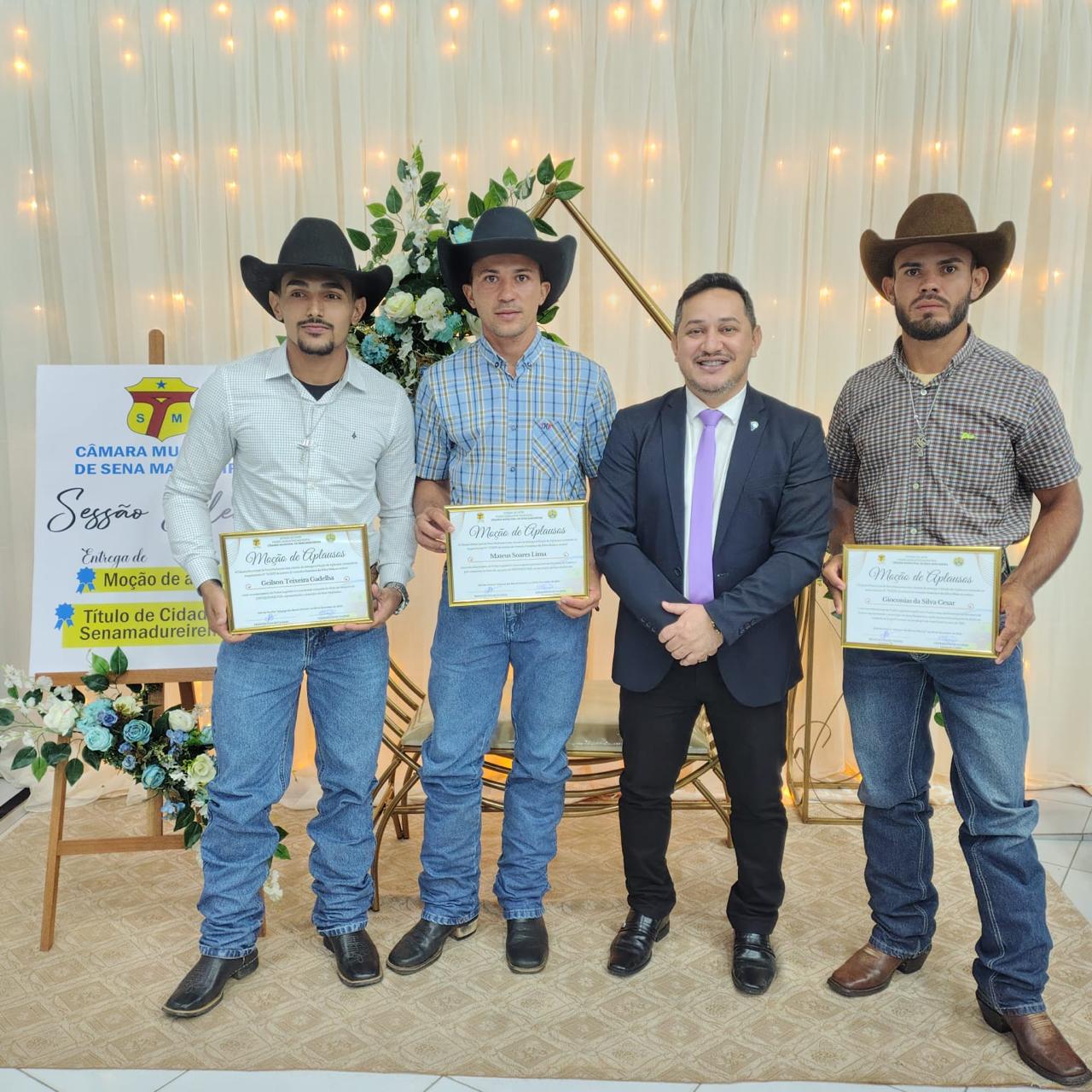 Durante a solenidade, receberam homenagem atletas senamadureirenses que conquistaram títulos expressivos em grandes exposições agropecuárias: um campeão da Expo Assis Brasil, realizada no município de Assis Brasil; outro vencedor da Expo Quinari; e o principal destaque local, Matheus Soares, consagrado campeão da Expo Sena 2025.