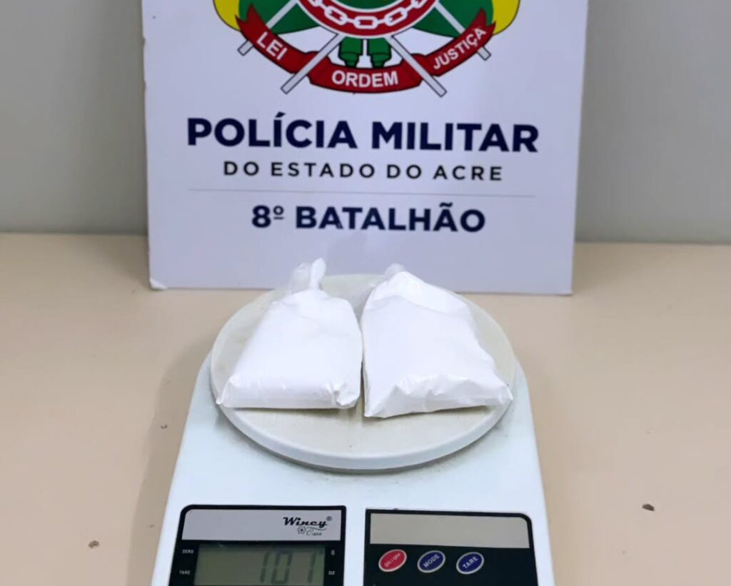 Policiais do 8º Batalhão da Polícia Militar do Acre prenderam um homem por suspeita de tráfico de drogas durante uma ação de policiamento ostensivo no bairro Eugênio Augusto Areal, em Sena Madureira.
