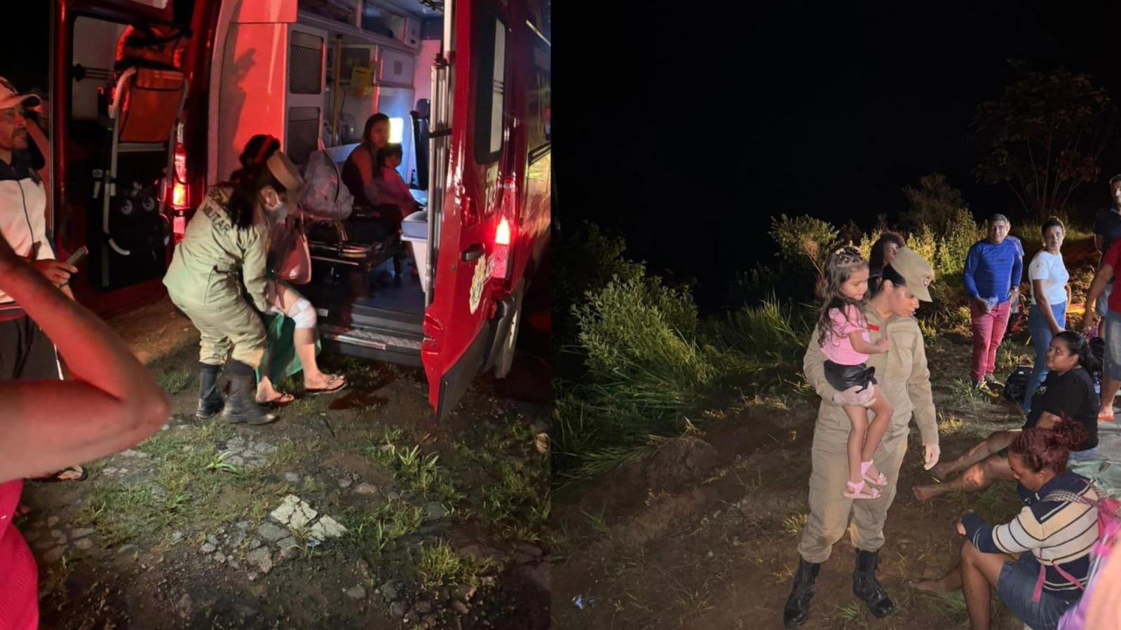 O coletivo transportava passageiros no momento do ocorrido. Equipes do Corpo de Bombeiros foram acionadas e prestaram atendimento no local, garantindo a segurança das vítimas e organizando a área até a retirada do veículo.