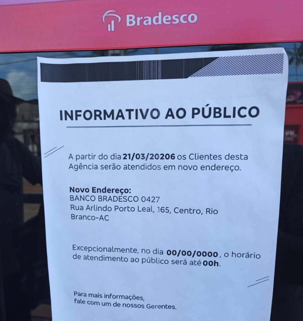 A unidade do Banco Bradesco localizada na Avenida Avelino Chaves, em Sena Madureira, será desativada a partir do dia 21 de março. A informação foi comunicada aos clientes por meio de um aviso fixado na entrada da agência.
