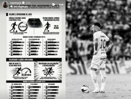 Nos stories do Instagram, ao publicar o relatório o camisa 10 escreveu: “Segundo jogo pós-cirurgia. Seguir evoluindo”. Os dados mostram o jogador entre os melhores do elenco em indicadores como velocidade máxima e número de sprints, ficando atrás apenas de Rony, reforço recente do time. A divulgação acontece em meio às críticas recebidas após a derrota por 2 a 1 para o Novorizontino, resultado que selou a eliminação santista no estadual.