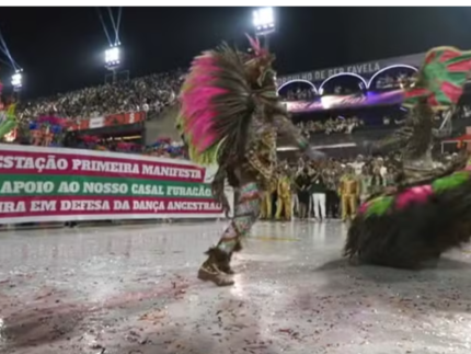 Logo atrás dos dois componentes, foi exibida a mensagem: “A Estação Primeira de Mangueira manifesta todo apoio ao nosso casal Furacão da Mangueira, em defesa da dança ancestral”.