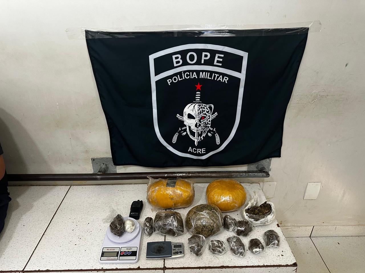 Uma guarnição do Batalhão de Operações Especiais (BOPE), através da companhia CHOQUE, resultou na apreensão de pouco mais de 2 kg de maconha e na detenção de um adolescente de 17 anos suspeito de tráfico de drogas no bairro Geraldo Fleming, em Rio Branco.