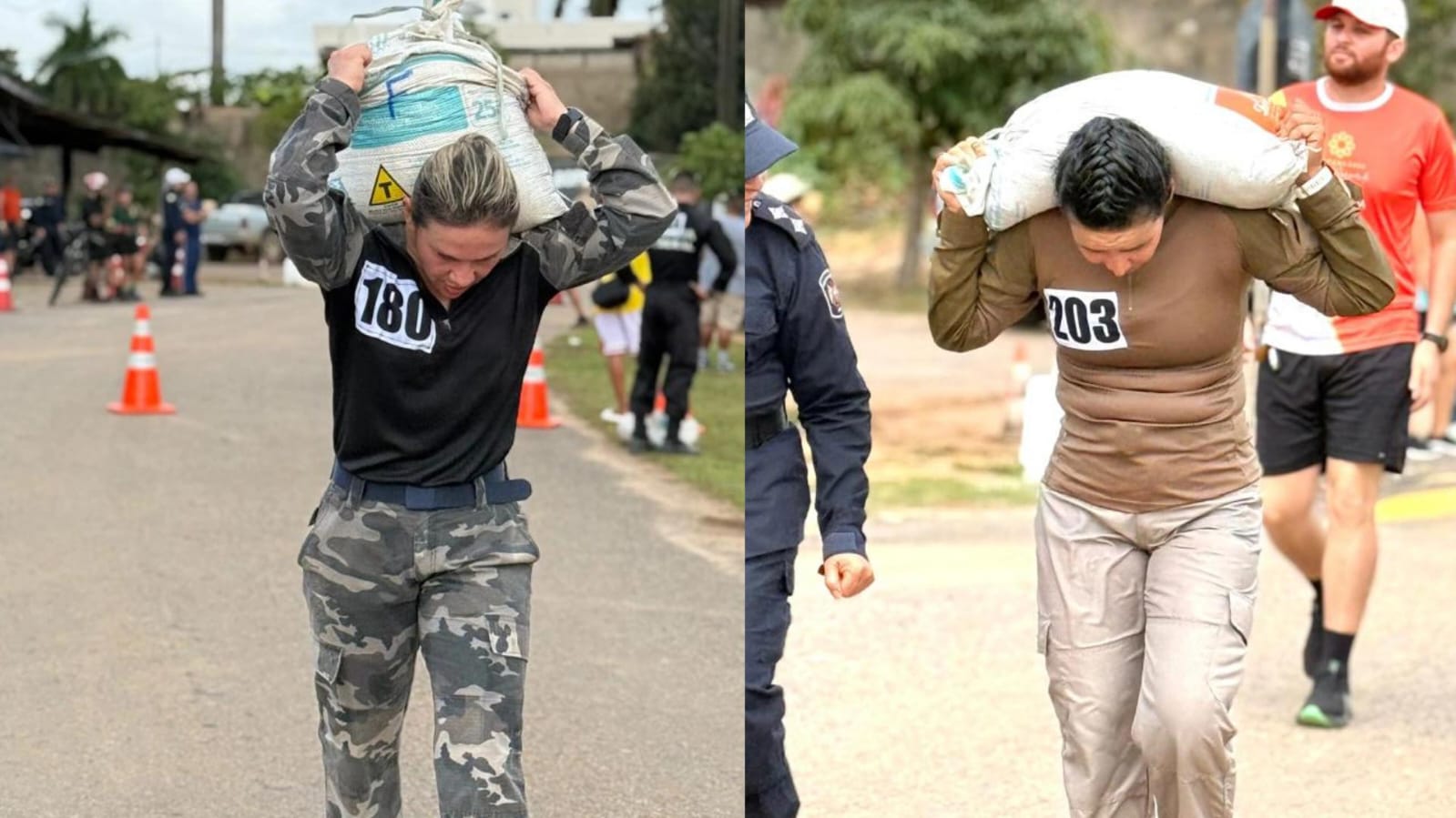 Na segunda etapa, os homens precisaram carregar um saco de 50 quilos por 400 metros até a entrada do estande de tiro. Para as mulheres, o peso foi de 40 quilos.