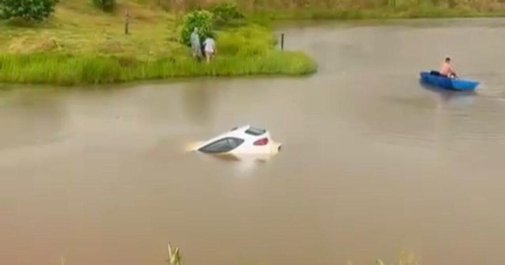 As imagens mostram o carro parcialmente submerso, chamando a atenção de moradores da região.
