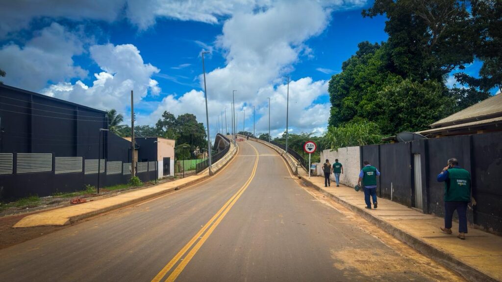 A intervenção também contemplou o entorno da ponte. O espaço sob a estrutura foi transformado em área de convivência, com parquinho infantil e praça com bancos. Durante a vistoria, a equipe identificou que parte do parquinho foi alvo de depredação após a entrega do equipamento público.