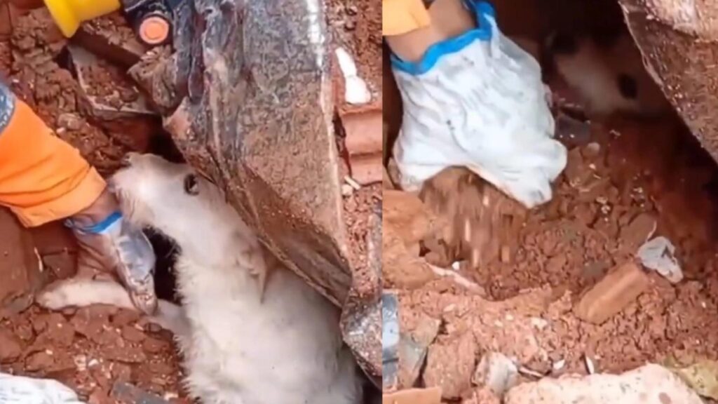 O animal foi localizado entre blocos de concreto e lama. Em imagens registradas no local, é possível ouvir os latidos enquanto um bombeiro remove cuidadosamente os entulhos até encontrá-lo. O cão, chamado Pumba, sobreviveu graças à estrutura de sua casinha, que formou um pequeno vão de proteção sob os destroços.