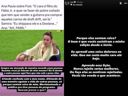 No trecho divulgado, Ana Paula diz que Fiuk “é filho do Fábio Jr. e quer se fazer de pobre coitado que tem que vender a guitarra pra comprar aqueles carros de drift”. A declaração foi feita durante uma conversa de Ana com Samira.